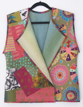 Crossover Collage Vest This is an asymmetrical vest with button-and-loop closure; you’ll see two other versions below. Using batiks, prints, and woven stripes, I collaged the right front over a layer of Osnaburg and foundation fabric, which becomes the lining, then randomly surface-stitched and washed the entire piece to create the crinkly texture. The left front and back are a Japanese fabric. The raw-edge binding is couched with a narrow chenille yarn. This vest is a pattern; See the Store. |